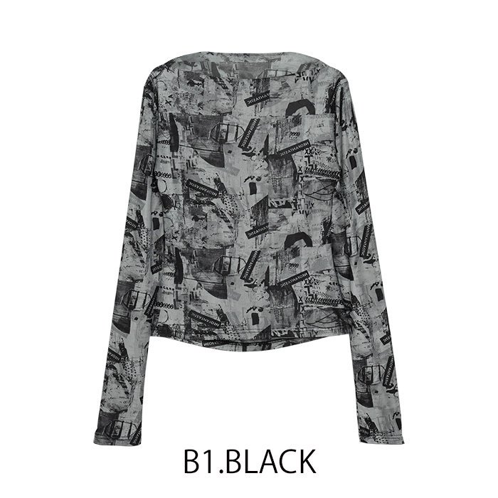 MICALLE MICALLE(ミカーレミカーレ)重ね着にもオススメ!ランダム英字ストレッチメッシュボートネック長袖トップス