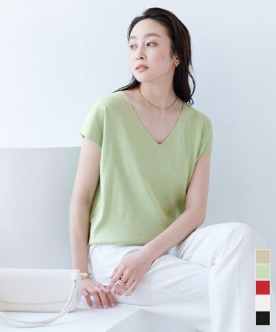 ゴールド釦Vネックフレンチスリーブニット【メール便可/100】